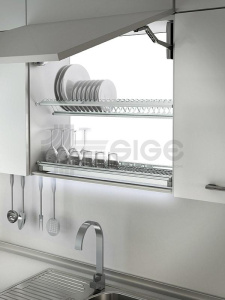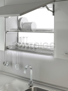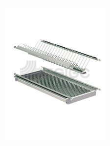 Escurridores de Platos para Gabinetes Aéreos: Esta conformado por una bandeja porta platos, una bandeja porta vasos de acero inoxidable AISI 304 y una bandeja recolectora de goteo de acero niquelado. Disponibles en medidas de 56.4 cm (22″) para módulos estándar de medida externa de 60.0 cm (35,4″) con profundidad ajustable 86.4 cm (34″) para módulos estándar de medida externa de 90.0 cm (35,4″) con profundidad ajustable.