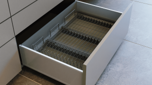 Escurridores de Platos para Caceroleros: Esta conformado por una bandeja recolectora de líquidos en polipropileno con juntas flexibles en el perímetro, rejillas porta platos y porta vasos en rejillas de acero AISI 304, combinado con un cacerolero MERIVOBOX de blum y disponible en ancho de 60 y 90cm