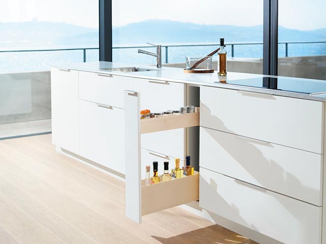 Con su idea para armarios estrechos, Blum ofrece una posibilidad sencilla para aprovechar incluso los espacios de almacenaje más pequeños en la cocina sin necesidad de renunciar a la estabilidad y a la calidad de movimiento. Las guías desplazadas en diagonal garantizan una mayor estabilidad lateral y una alta capacidad de carga de hasta 20 kg por cada armario inferior. Según los deseos de cada cliente, esta solución se basa en sistemas box o en cajones de madera con los sistemas de guías adecuados.