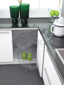 Es una sencilla y económica solución para los muebles de esquina, específicamente para las esquinas ciegas, consta de 2 cestas giratorias de extracción parcial con fabricación enteramente en rejilla cromada con diámetro de 760mm para muebles con puertas de al menos 450mm de ancho.