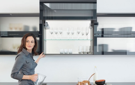 AVENTOS HF es la solución para armarios colgantes superiores y centrales con frentes de dos hojas, tanto en la cocina como en la sala de estar.