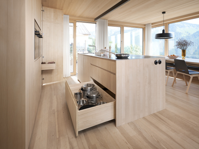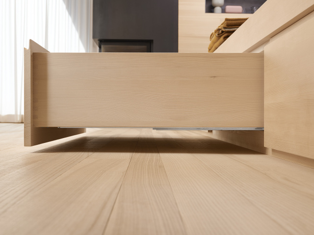 MOVENTO es estable y cuenta con capacidad de carga. Gracias a los buenos valores de caída, el sistema de guías también resulta adecuado para aplicaciones a ras del suelo. Esto hace que la extracción total con carga de 40 kg sea la primera opción. Para todos los sectores de la casa, incluso al utilizar módulos extraíbles anchos, altos o profundos.