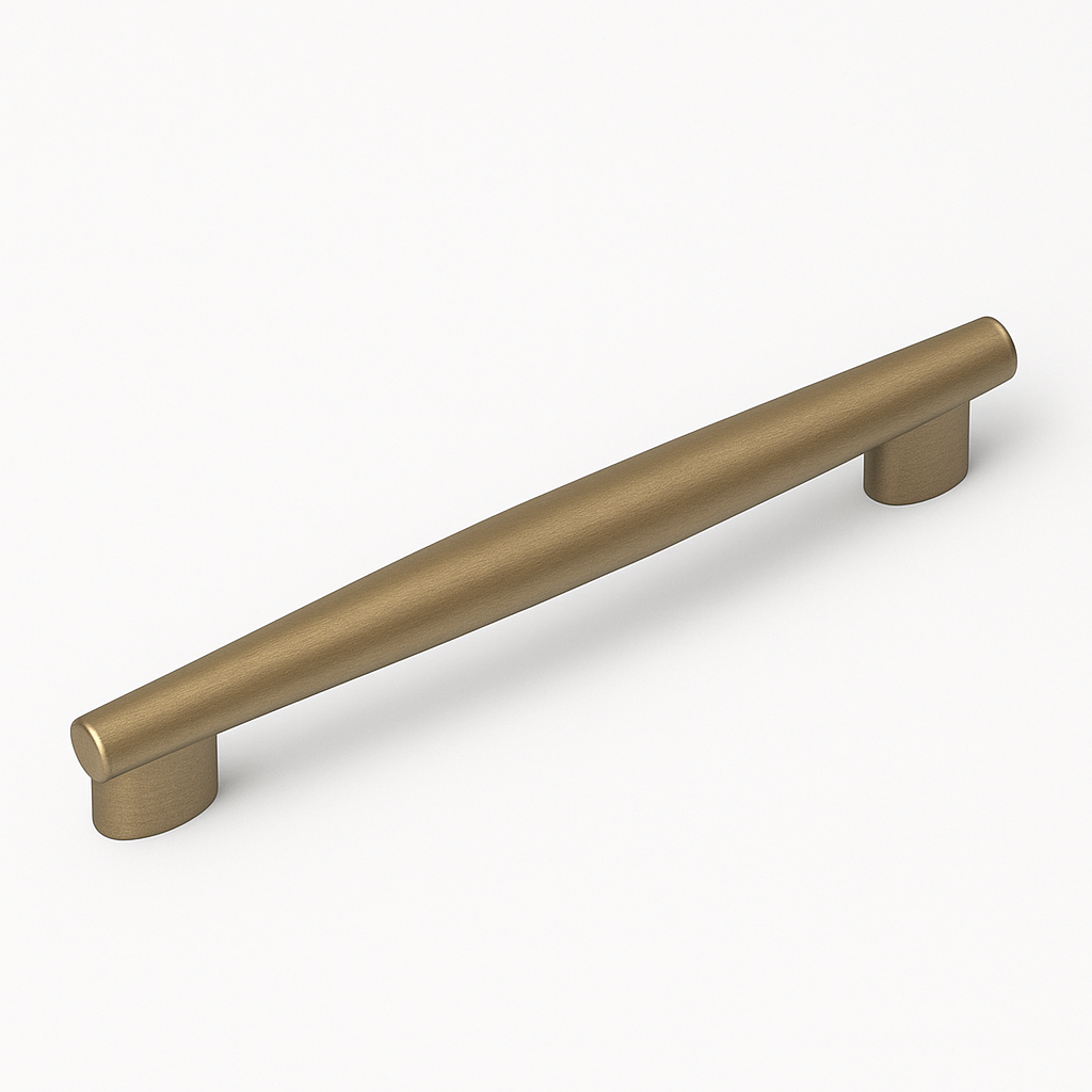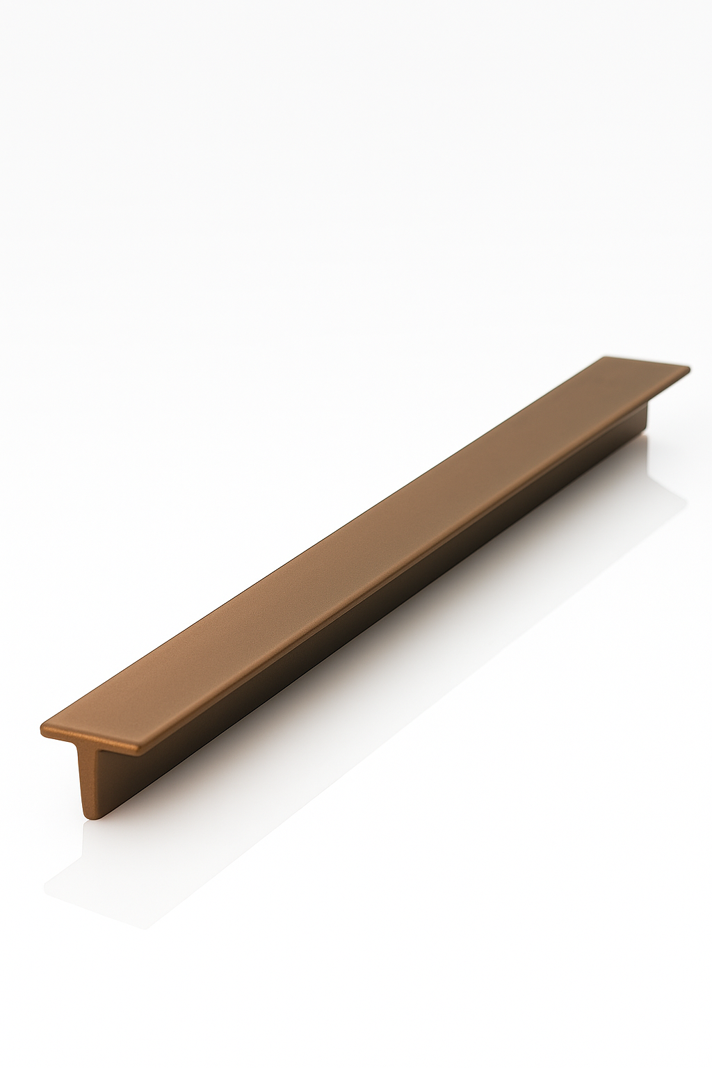 Tirador modelo BOLD de material Zamak (aleación de Zinc, Aluminio, Magnesio y Cobre), disponible en acabados champagne claro y bronce; largos de 160 mm y de 320 mm.