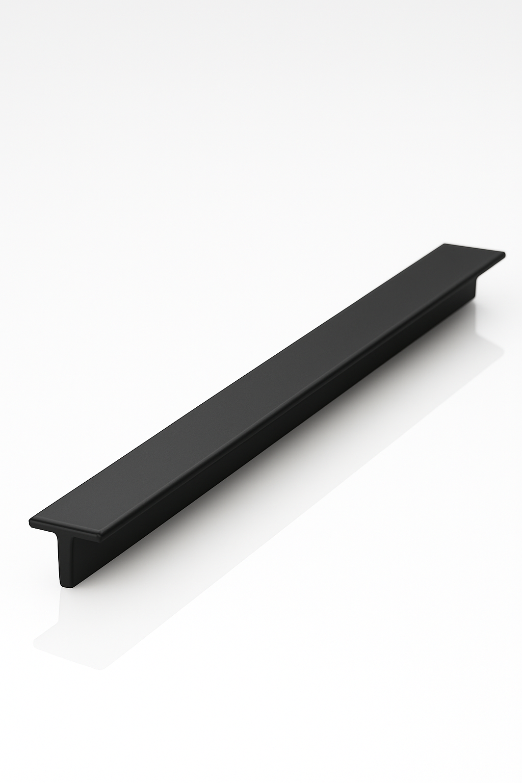 Tirador de canto modelo CAPELLO fabricado en aluminio, disponible en acabados champagne claro y negro mate; largos de 100 mm y de 200 mm.